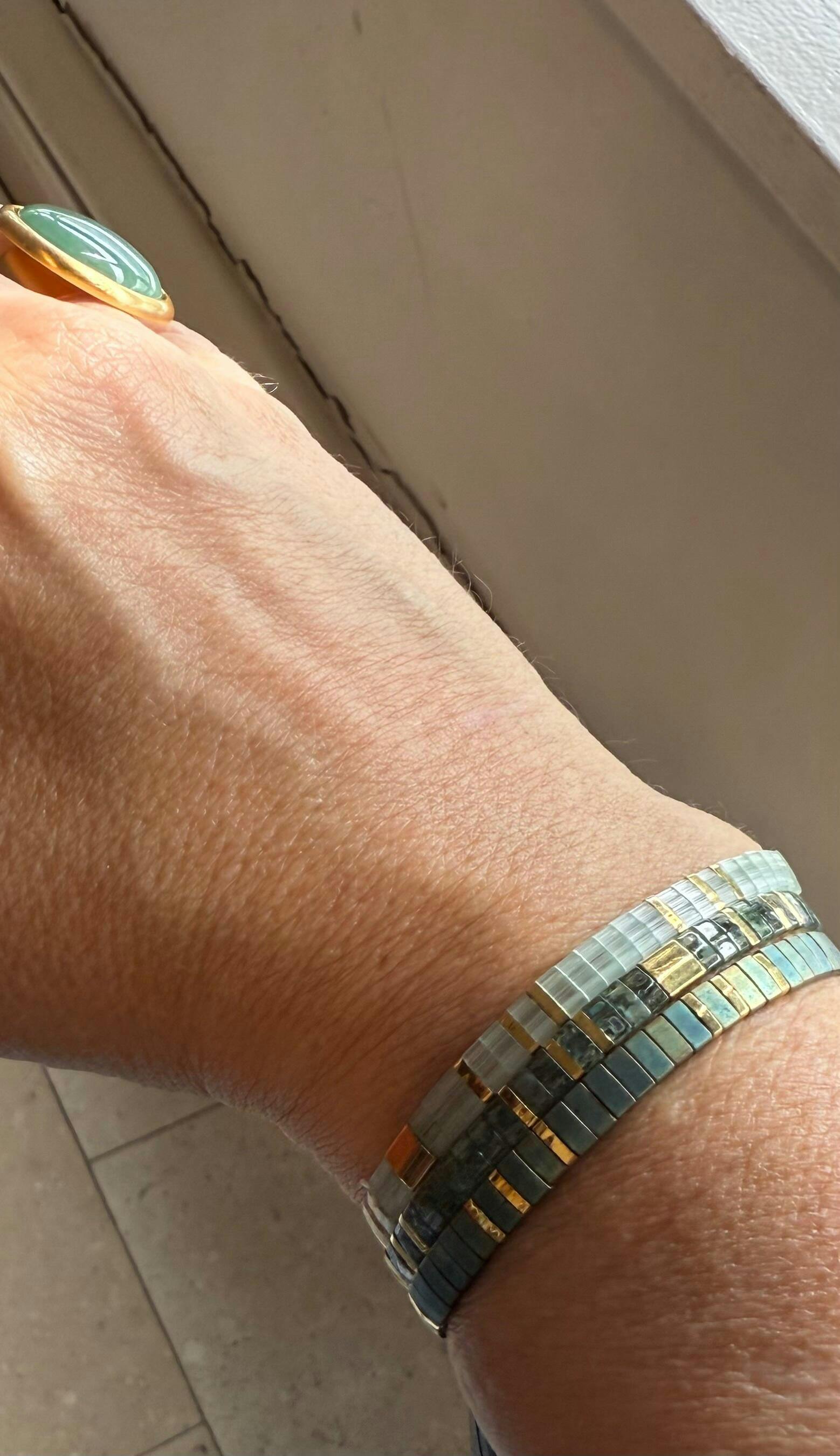 La parure Luna associe les bracelets de perles plates Luna, Charlie et Mya, réalisés à la main avec des perles Miyuki du Japon, réputées pour leur éclat et leur finesse.