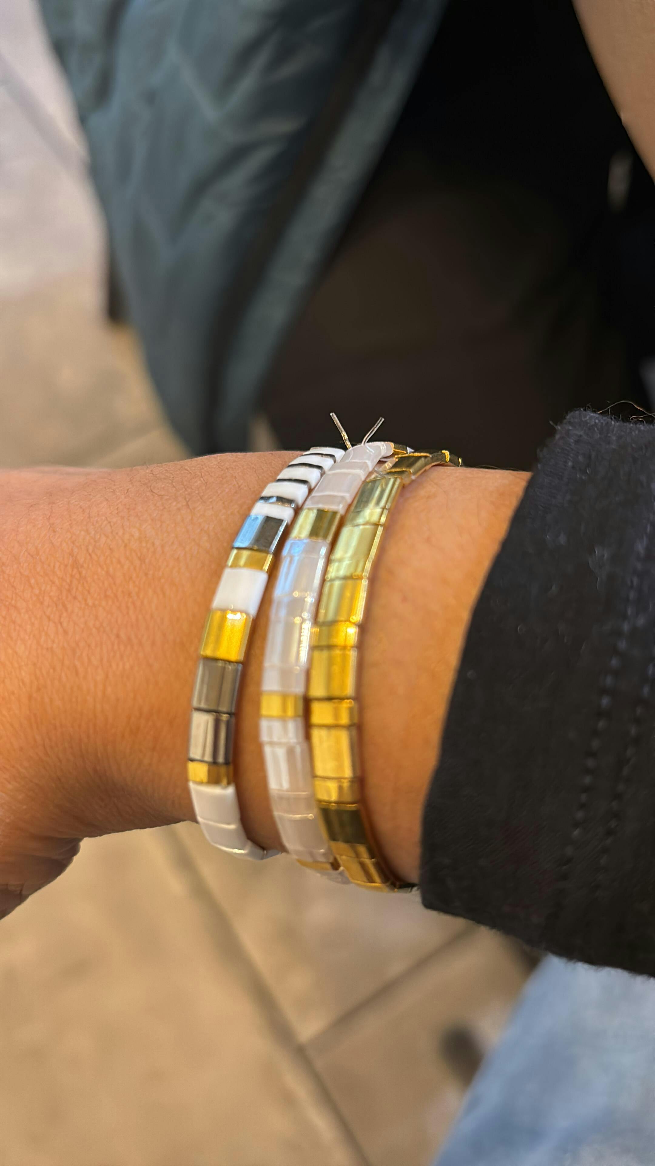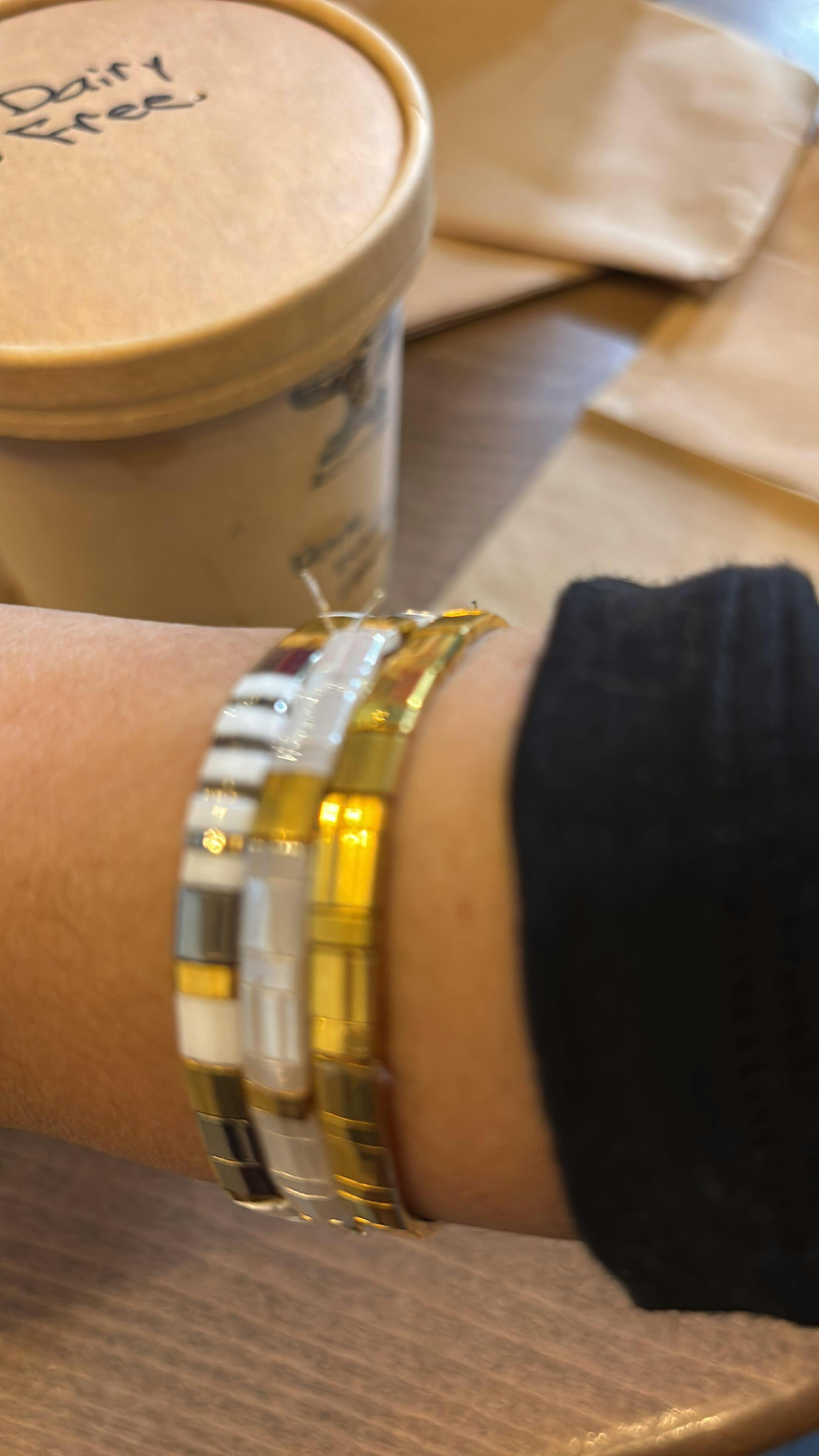 La parure Sun réunit les bracelets Or, Neige et Cilla, façonnés à la main avec des perles authentiques Miyuki du Japon. Chaque perle dorée est plaquée or 24k, assurant un éclat raffiné et une qualité qui traverse le temps.
