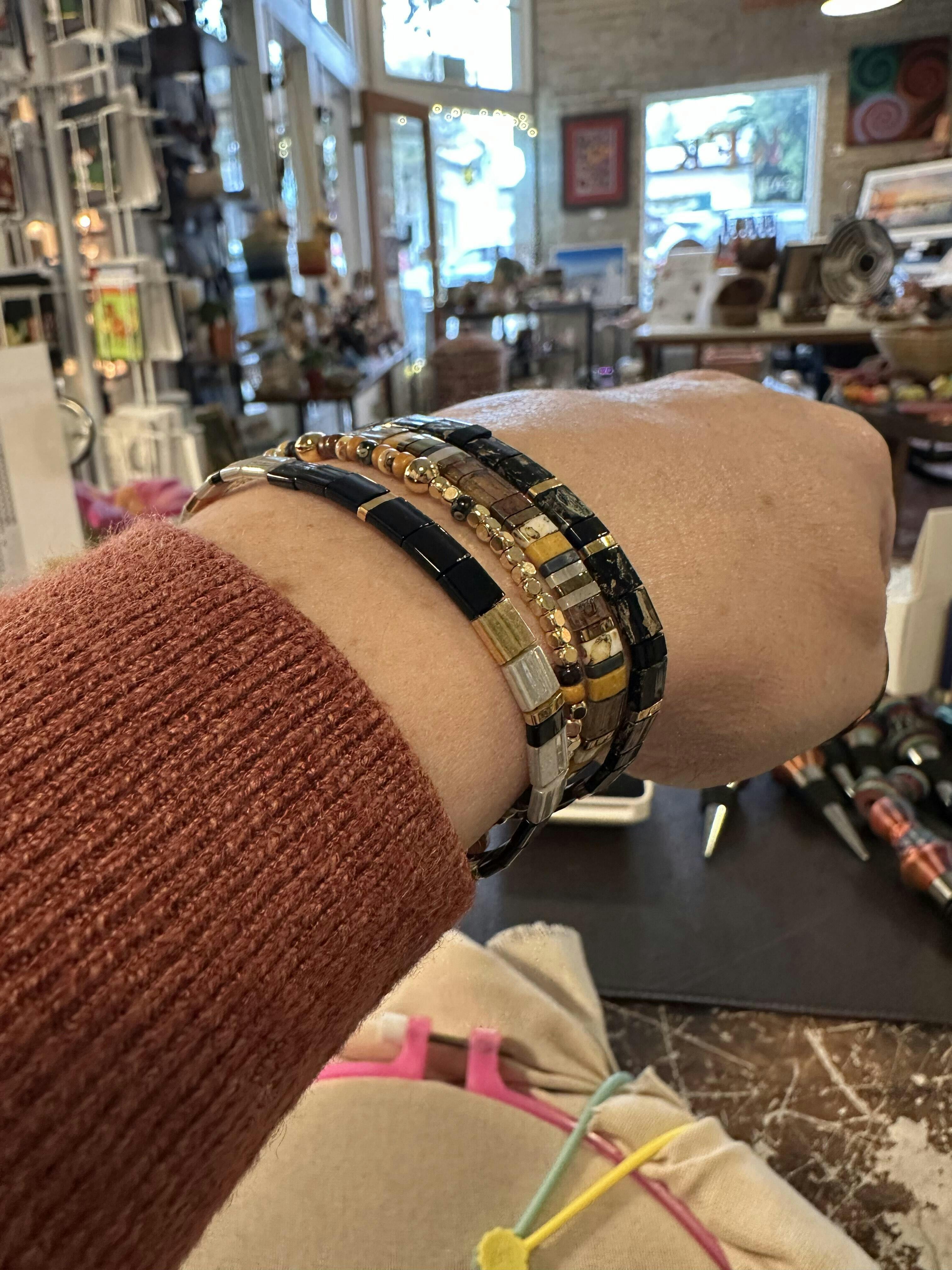 La grande majorité de nos bracelets sont montés sur un fil élastique coréen ultra-résistant, facile à enfiler et très confortable au quotidien - sans fermoir métallique. Cela leur donne un effet "seconde peau" que nos clientes adorent. ✨
