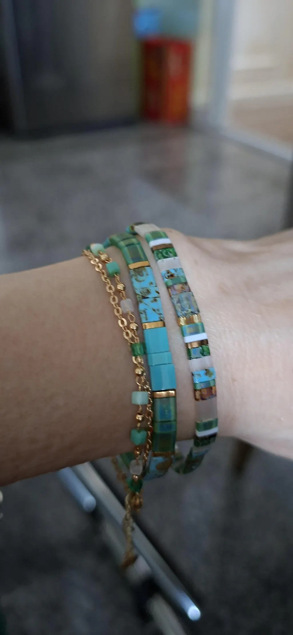 Authentic Japanese glass beads (50 per bracelet), natural stones (30 per bracelet), and stainless steel with fine gold plating.