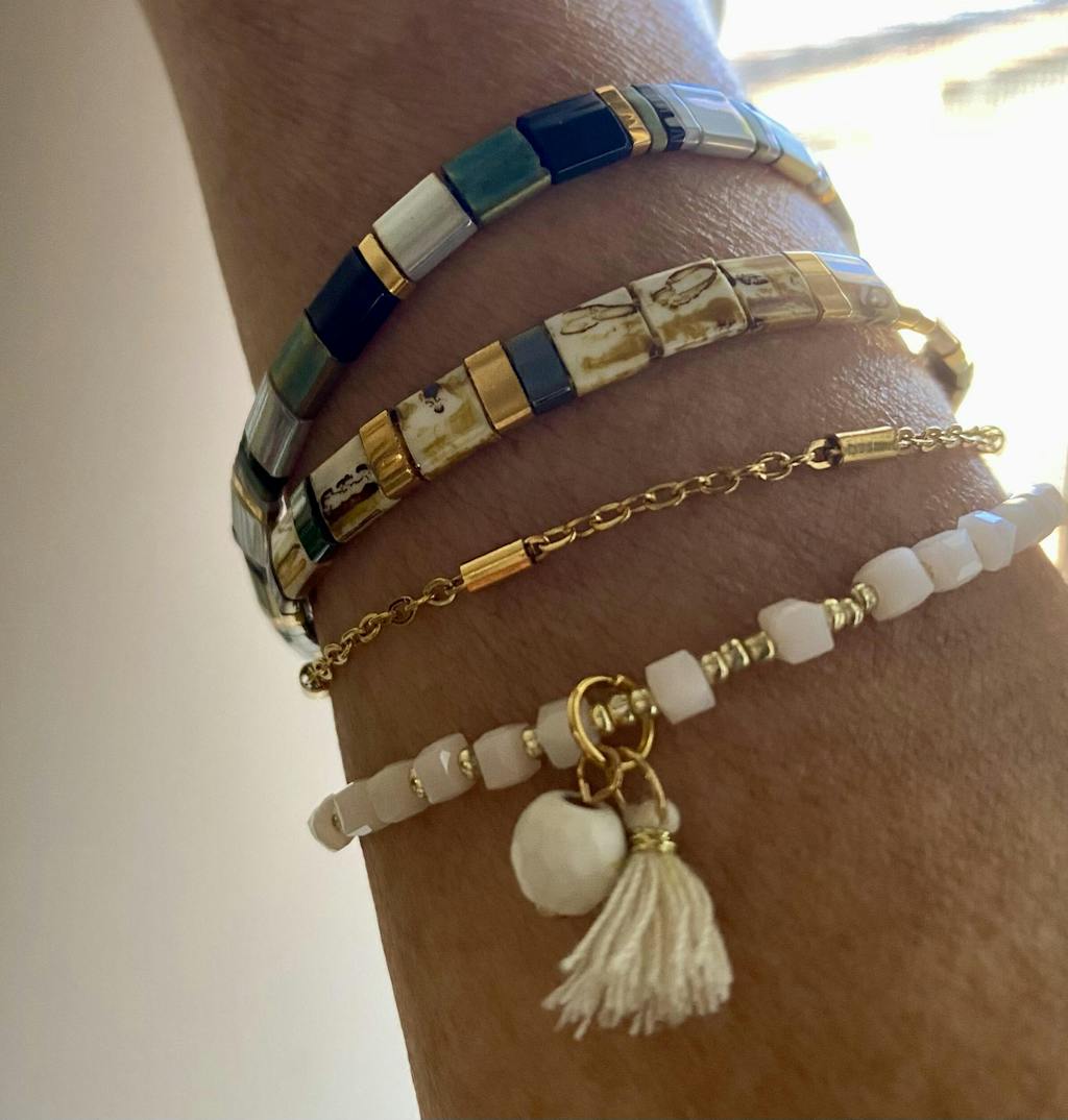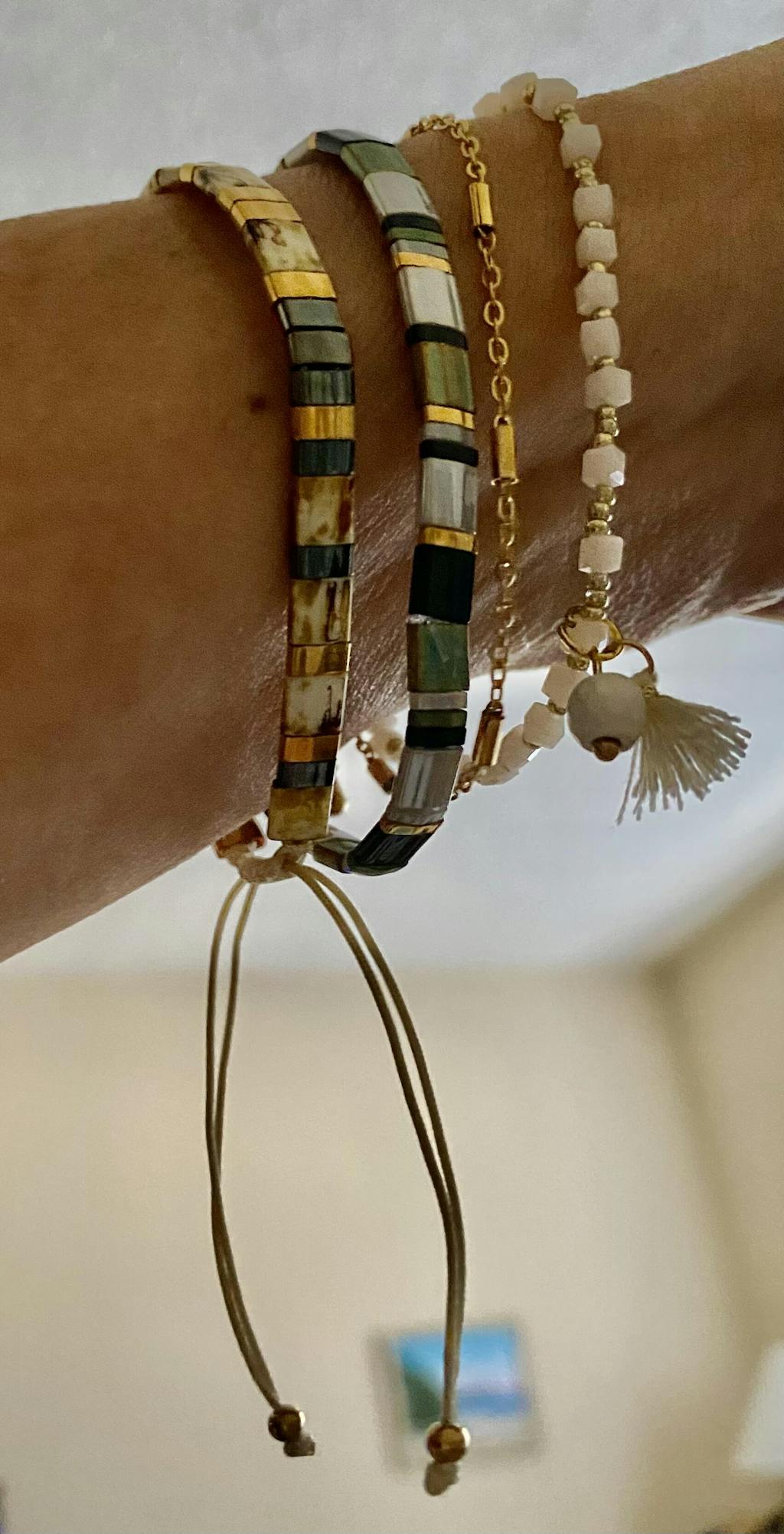 The Abby set from Køss Design brings together two perfectly complementary bracelets: our iconic Abby bracelet, featuring natural stones and a delicate tassel, and the Nelya bracelet, handcrafted with authentic Miyuki beads from Japan in soft shades of gold, cream, and pearly grey.