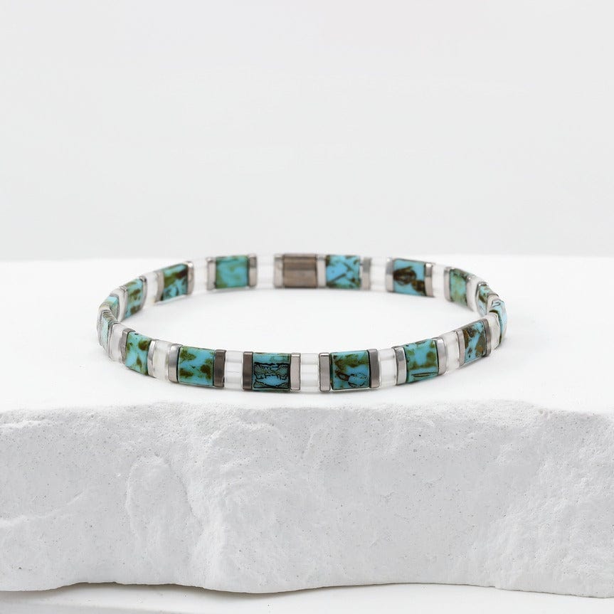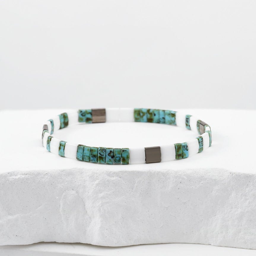 Showcasing a luminous palette of milky white, vibrant turquoise, pale sky blue, and soft mauve accents, this striking quartet elevates any ensemble with effortless style. The flat Miyuki Tila beads and their tonal variations create a light, chic, and summer-inspired look reminiscent of the serene ocean depths.