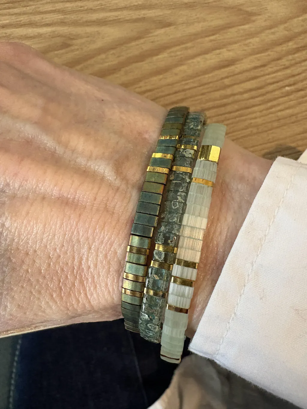 With its subtle green shades, this unique set brings a fresh, sophisticated touch to any outfit — from your everyday looks to your most elegant occasions. Beautiful worn alone or layered with other bracelets for a timeless, effortless style.