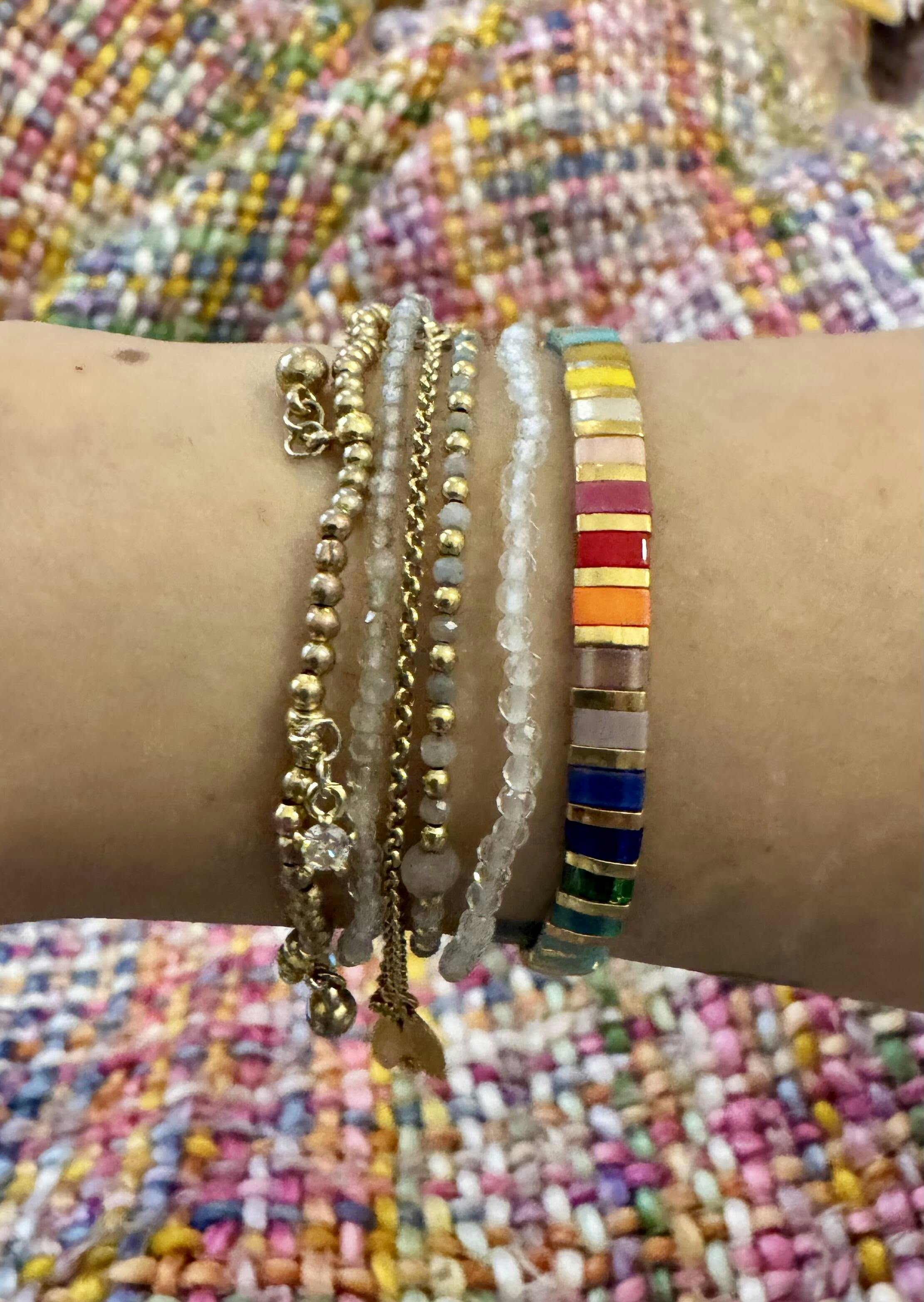 Avec son dégradé de couleurs vives et harmonieuses, ce bracelet en perles plates multicolores apporte une touche joyeuse et lumineuse à toutes vos tenues, du quotidien aux moments les plus spéciaux.