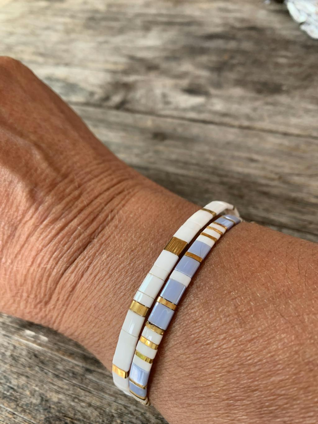 Perles en verre authentiques du Japon (50 par bracelet), pierres naturelles (30 par bracelet) et acier inoxydable doré à l'or fin