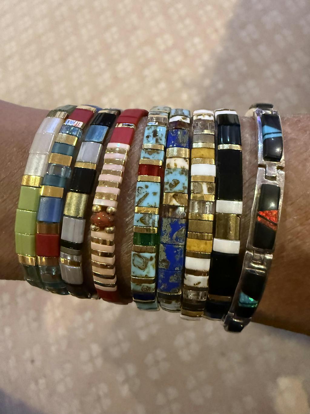 La parure Lou associe les bracelets de perles plates Asa et Jola, confectionnés à la main avec des perles Miyuki du Japon, sélectionnées pour leur éclat subtil et leur qualité exceptionnelle.